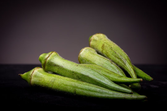 Lot of Okra or Ladies' fingers vegetable in graphic moody frame. Studio low key still life of edible food in spotlight contrasted against a dark background