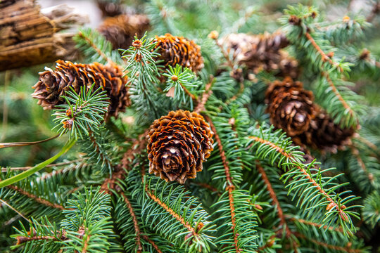 Close-up of young branches of Picea abies (Norway spruce) with fresh green needles in an autumn park, captured in natural daylight.