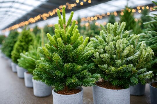 Christmas fir pine tree growing in a nursery near forest. Close up shot, shallow depth of field, no people