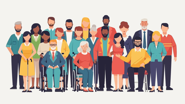 A diverse group of people of various ethnicities, ages, and abilities standing together, representing inclusivity and community.