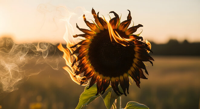 Dramatic Sunflower Ablaze: Fiery Petals and Wisps of Smoke Against Sunset Background, Conceptual Metaphor