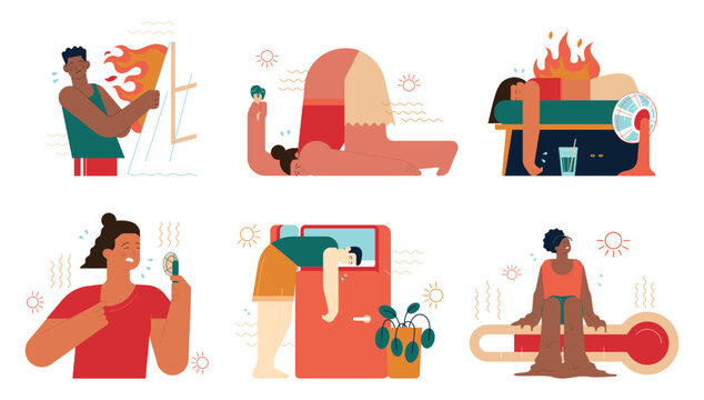 Exhausted woman suffers from heat fanning with paper fan. Stressed overheated girl sweating suffocating from seasonal abnormal summer temperature, stuffiness, trying to cool down, relief discomfort.