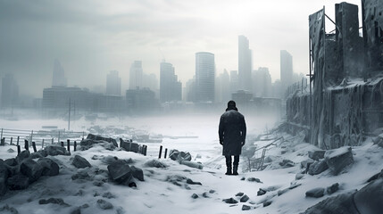 The street and cars are full of snow after a big snowstorm during winter season. Generative AI