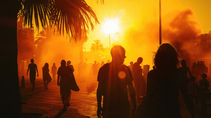 Abnormal heat in big city. Walking outdoor on sunny day, hot weather