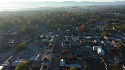 Aerial orbit around Charles Town, WV showing Ranson and the American Public University campus with fog settling on the countryside.