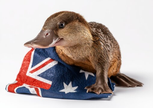 Australian platypus draped with its nation's flag on display with captivating charm