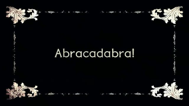 A re-created film frame from the silent movies era, showing an intertitle text: abracadabra (a word used when performing magical tricks), with and without quotes.