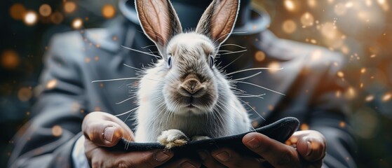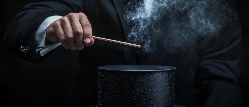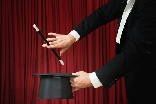 Abracadabra. Professional stage magician performing with top hat and magic wand