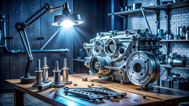 A shiny silver engine lies disassembled on a workshop table, various tools and parts scattered around, illuminated by a bright overhead light source.