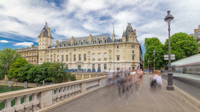 Building of Cour de cassation and traffic on Saint-Michel bridge timelapse hyperlapse in Paris, France