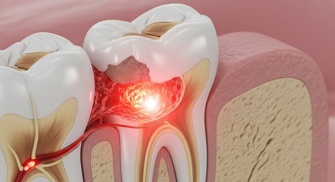 Anatomy of a Toothache - Glowing Red Inflammation in a Decayed Molar Cross-Section.