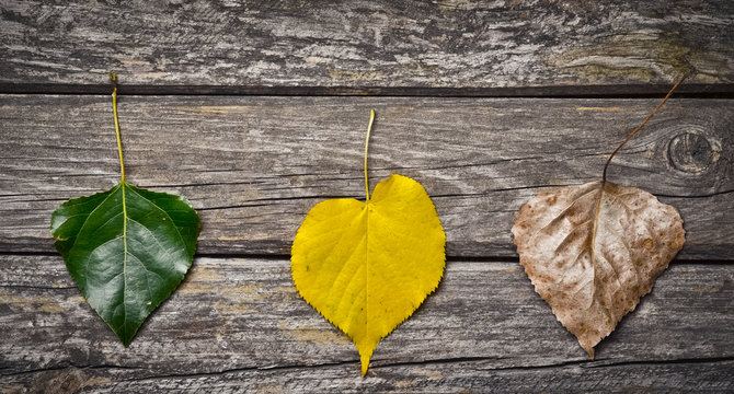 The process of yellowing and drying of autumn leaves of poplar on old wooden boards. Top view.