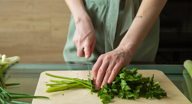 Crop woman cutting off parsley stems