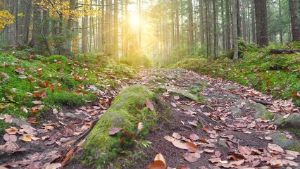 Autumn forest with coniferous trees, green moss and shine of beautiful setting sun