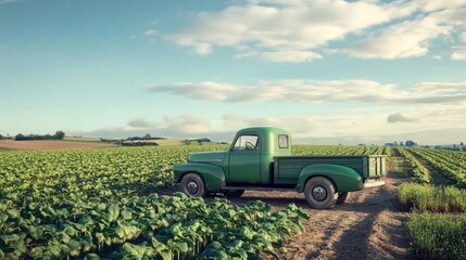 A classic green truck parked on a farm, surrounded by fields of crops ready for harvest.