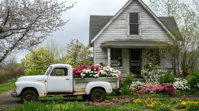 A classic white truck with a trunk full of lush spring flowers, parked beside a charming farmhouse with a blooming flower bed, capturing a countryside scene
