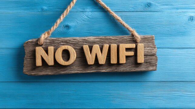 Sign with no wifi hangs on blue wooden wall showing absence of internet access in the area