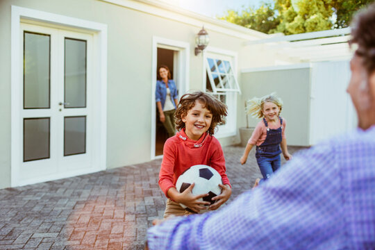 Young children running to the arms of their absent father in the driveway