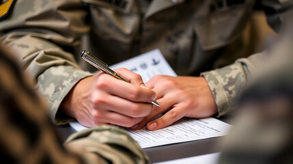Military personnel complete absentee ballot forms. Person in uniform fills out paperwork. Hands hold pen over document. Voting process for service members. Civic duty, participation in elections.