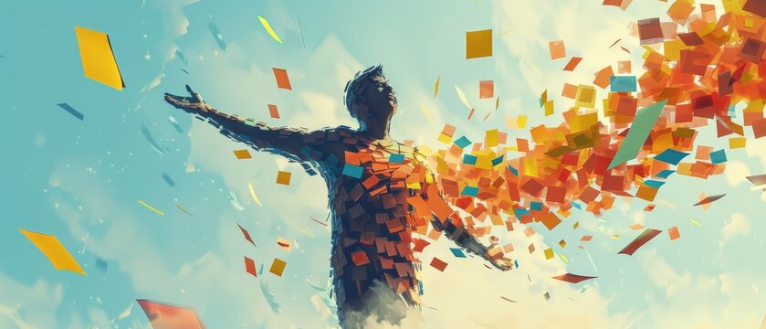 man stands with open arms and the notes fly into him he tries to absorb all the knowledge from the notes