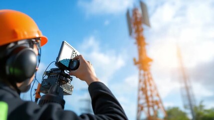Modern Communication: A skilled engineer, absorbed in precise measurements, meticulously inspects a cell tower, ensuring seamless communication in a world.