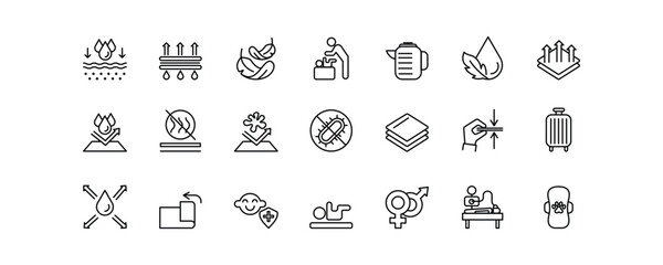 A collection of editable stroke icons illustrating features of absorbent pads: waterproof, breathable, antibacterial, safe for babies, pets, and daily hygiene.