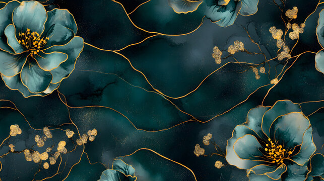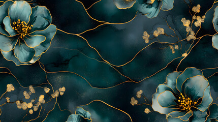 Seamless Japanese floral pattern, alcohol ink, blue and emerald green color with gold lines. Abstract marble pattern for background banner.