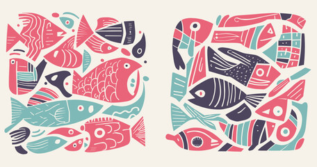 Set of colorfull illustrations with various fishes in linocut style. Flat design of ocean fishes