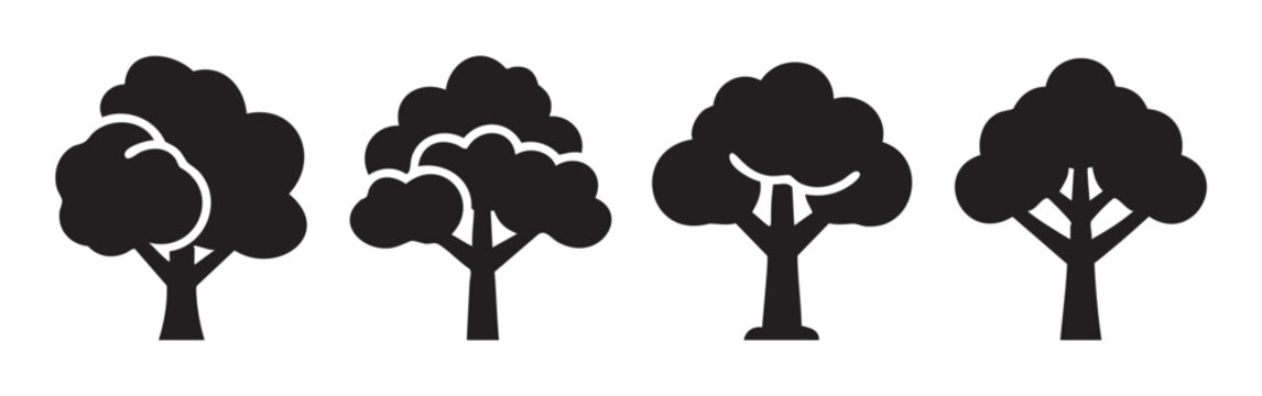 Four distinct black silhouette tree icons representing nature's diversity and environmental themes in a simple graphic vector style.
