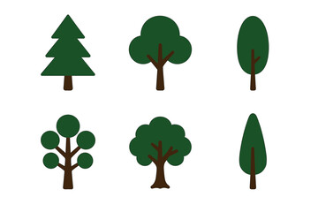 Six stylized green trees with brown trunks, each with a different shape, displayed in two rows on a white background.