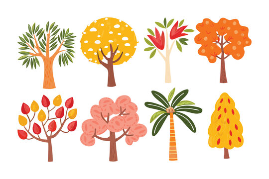 Illustrative Tree Variety: An array of diverse illustrated trees showcase varying shapes, colors, and leaf patterns, symbolizing the beauty of nature and the changing seasons.