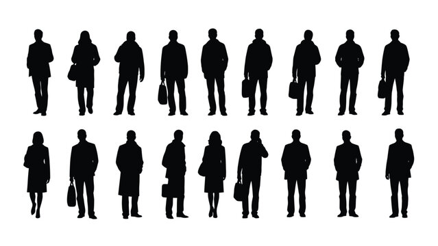 People Silhouettes Vector Set: Professional Men and Women Standing and Walking, Entourage Figures for Architectural Drawings and Graphic Design