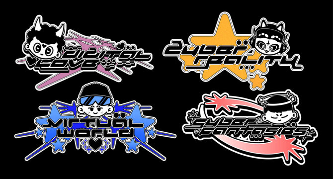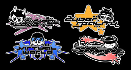 Retro Y2K logo. Abstract colorful graphic with cyber characters, streetwear t-shirt slogan typography style logo. Vector set