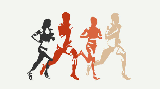 Athletics, track and field runners, group of running men and women. Set of abstract isolated vector silhouettes. Ink drawing