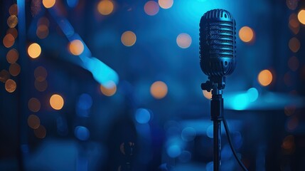 Old retro microphone on abstract music background with notes and icons symbolizing melody.