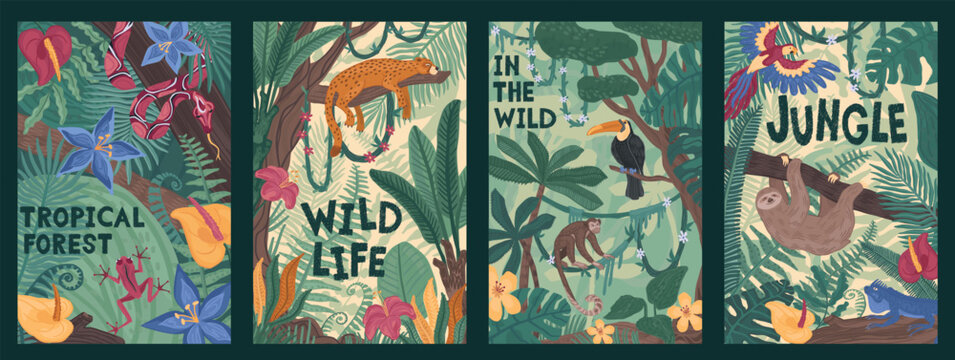 Abstract jungles. Tropic animal forest, abstract nature art posters with safari bird and doodle plant. Exotic palm and liana. Snake and cartoon jaguar. Print or pattern. Vector background