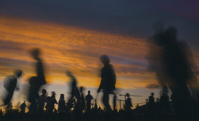 business people crowd walking commuting in the city, lights and motion blur abstract