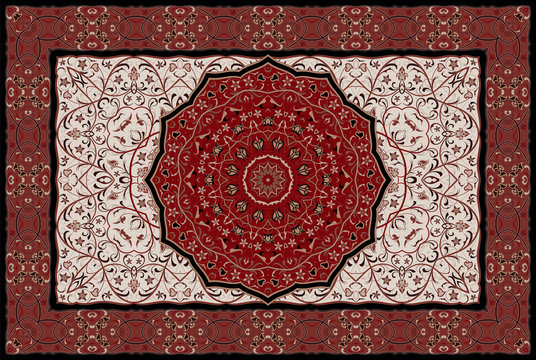 Vintage Arabic pattern. Persian colored carpet. Rich ornament for fabric design, handmade, interior decoration, textiles. Red background.