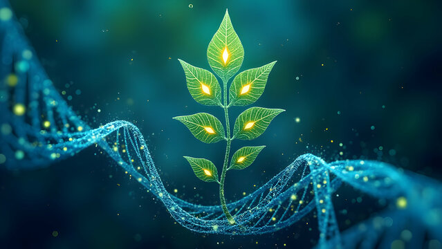 Geometric Plant Forms with Leaves Composed of Hexagonal Cells Containing Glowing Vitamin Symbols Emerging from Spiral Genetic Code