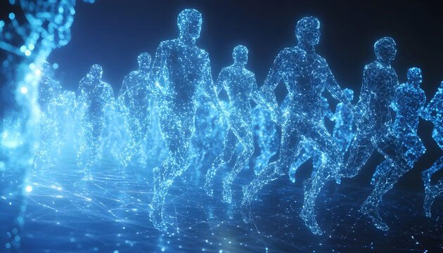 Wireframe figures run across glowing blue landscape, embodying virtual battle. Digital constructs engage in simulated combat. Futuristic soldiers, abstract technology network, particles form human