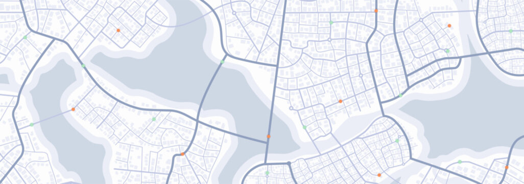Extensive city scheme featuring points of interest. Abstract navigation plan of the urban area. General city map indicating streets, roads, and buildings. Colored flat, editable vector illustration