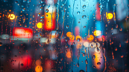 Blue background of natural water condensation, window glass with high air strong humidity, large drops drip. Collecting and streaming down