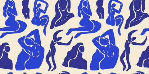 Abstract blue women seamless pattern. Background illustration of flat cartoon woman figures, young vintage art female wallpaper. Backdrop design for fashion fabric or modern trend print.
