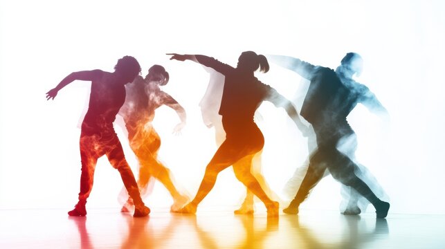 Dynamic silhouettes of dancers showcasing fluid movements against a vibrant color backdrop with space for text. Generative AI