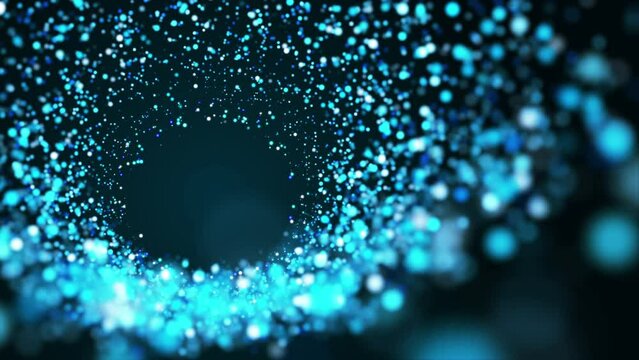 Blue circles of particle waves diverging from center. Colorful glowing brilliant swirl. Looped abstract animation.
