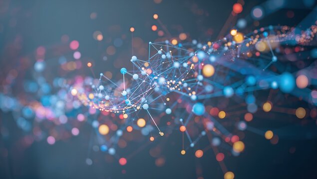 Dynamic abstract network of glowing nodes and connections symbolizing digital data flow and modern technology.
