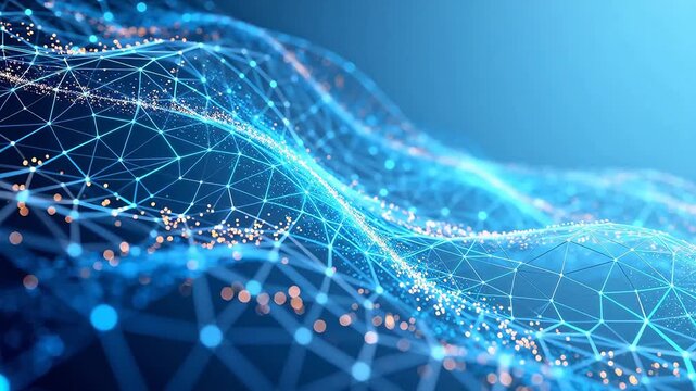 Stunning abstract digital network of glowing nodes and connections on a deep blue background, perfect for technology concepts and data visualization.