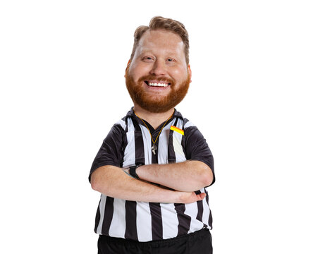 Happy referee. Funny man with a caricature face isolated over white background. Cartoon style character with big head. Concept of sport, meme emotions.