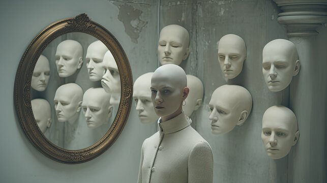 Absurd mirror scene. A bald woman is reflected in a mirror.