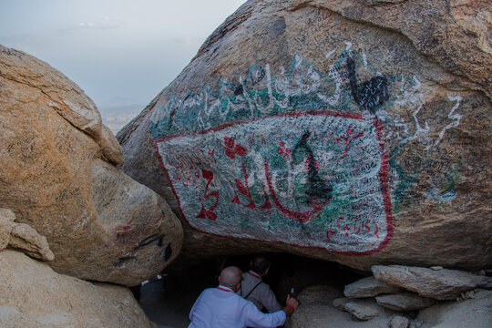 Ghar Thawr. Muslim pilgrims visiting Thawr Cave in Mecca - Saudi Arabia.
